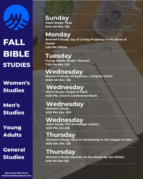 At Windsor Christian, we believe that studying the Word of God together is one of the best ways to grow in our faith. Our Bible Studies are a place to dig into God's Word, ask questions, and fellowship with one another as we follow Christ. Whether you're new to church or have been walking with God for years, you're welcome to join us.